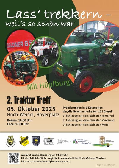 Der 2. Traktor-Treff findet auf dem Hoyerplatz in Hoch-Weisel statt! Von 10:00 bis 17:00 Uhr gibt es für große und kleine Besucher einiges zu sehen und zu erleben.